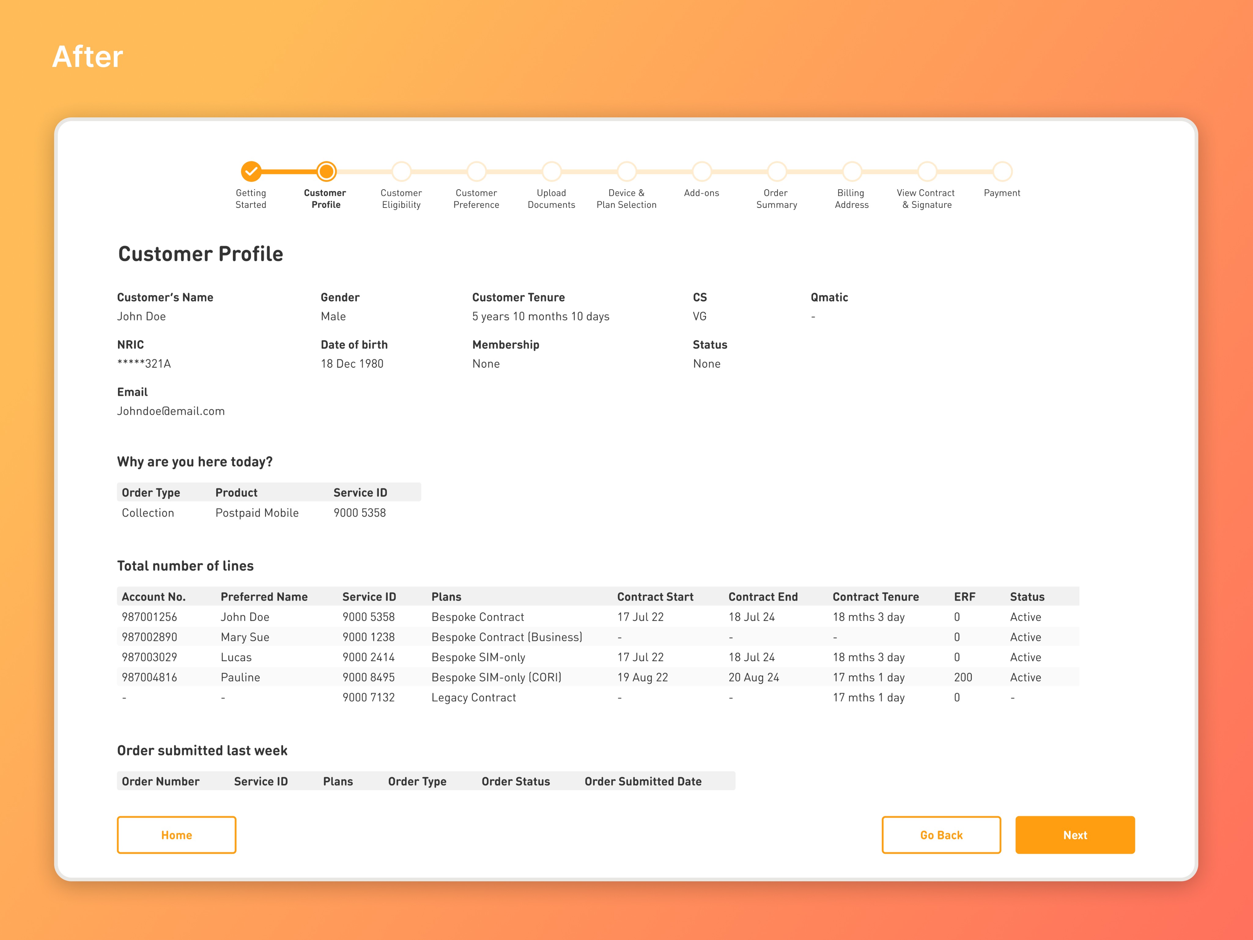 The redesign was met with high praise from stakeholders and employees alike, achieving a 30% reduction in the sales process steps and at least 40% time savings for customers.
